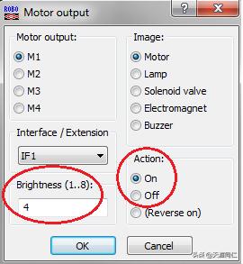 將其中一個電機模塊的動作設置為"Off(停止)",另外四個電機模塊的亮度分別設置為"2"、"4"、"6""8":
