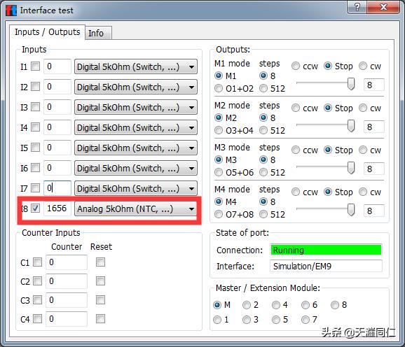 本例中,將NTC電阻連接到TX控制器的I8輸入端口,在ROBO Pro軟件中設置正確的環境和接口連接方式,然后打開接口測試窗口,在I8輸入口類型上選擇"Analog 5kohm(NTC,…)",只有正確的設置與傳感器相匹配的類型后,軟件才能讀取并顯示正確的數值。
