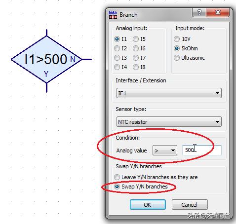 設置第一個"模擬分支"模塊的判斷數值為剛才所記錄下的"室內溫度值"減去25(25為誤差精度),然后選擇交換"Y/N分支";其他的四個"模擬分支"模塊的判斷數值分別為"手指溫度值"到"室內溫度值"的數值區間的4等分區間絕對值,設置交換"Y/N分支":