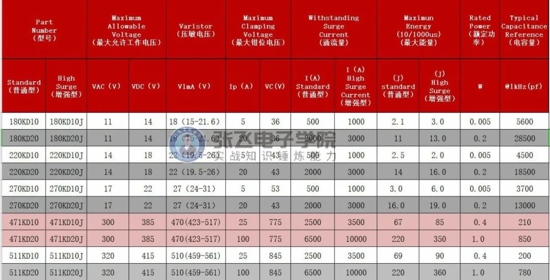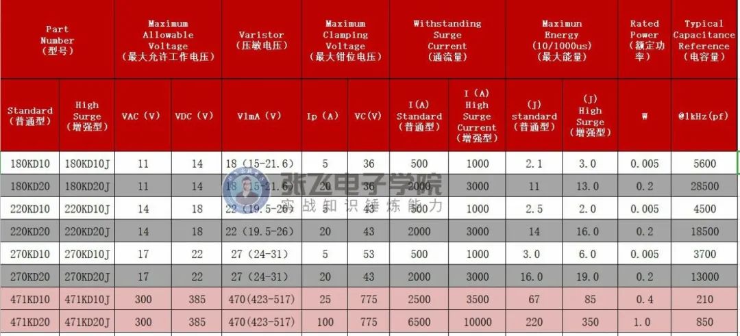 列如我們常用的471 它的大允許電壓AC300V DC385V同時通流量也是需要注意的,一般規(guī)格書上給出來的通流是1次的通流量,我們在選取的時候一定需要留有很大的余量,通流量是我們選擇直徑的依據(jù),如果一個417KD10 的壓敏電阻在計算的時候剛好接近規(guī)格書上的通流量2500A,我們可以選取兩個來并,如果空間不夠的時候我們可以選擇加強(qiáng)型的。