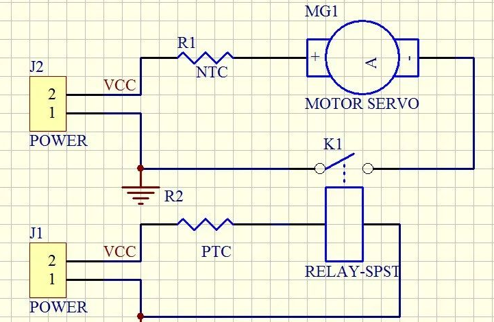 在此電路中,R2是PTC電阻,R1是NTC電阻,K1是繼電器,MG1是電機