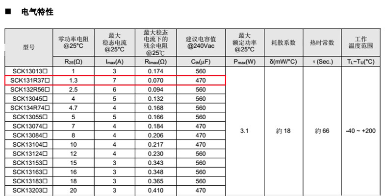熱敏電阻: VT 熱敏電阻型號: SCK131R37MSY 熱敏電阻片徑: Φ13mm 零功率電阻@25℃: 1.3Ω 工作溫度范圍: -40℃±170℃ 儲存溫度范圍: -40℃±85℃