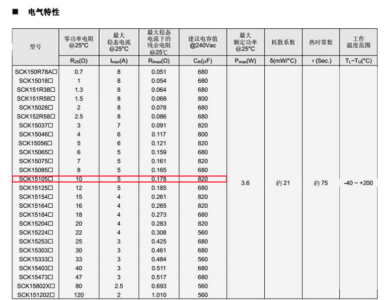 熱敏電阻: TKS 熱敏電阻型號: SCK15105MSY 熱敏電阻片徑: Φ15mm 零功率電阻@25℃: 10Ω 工作溫度范圍: -40℃±200℃ 儲存溫度范圍: -40℃±85℃