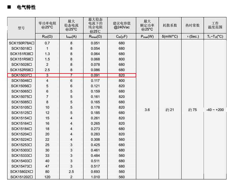 熱敏電阻: 穩騰 熱敏電阻型號: SCK15037MSY 熱敏電阻片徑: Φ15mm 零功率電阻@25℃: 3Ω 工作溫度范圍: -40℃±200℃ 儲存溫度范圍: -40℃±85℃