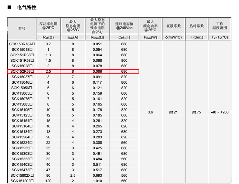 熱敏電阻: VT 熱敏電阻型號: SCK152R58MSY 熱敏電阻片徑: Φ15mm 零功率電阻@25℃: 2.5Ω 工作溫度范圍: -40℃±200℃ 儲存溫度范圍: -40℃±85℃
