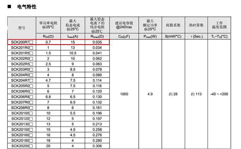 熱敏電阻: 穩騰 熱敏電阻型號: SCK200R7MSY 熱敏電阻片徑: Φ20mm 零功率電阻@25℃: 0.7Ω 工作溫度范圍: -40℃±200℃ 儲存溫度范圍: -40℃±85℃