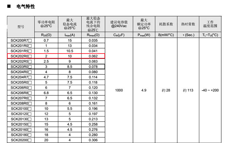熱敏電阻: 穩騰 熱敏電阻型號: SCK202R0MSBY 熱敏電阻片徑: Φ20mm 零功率電阻@25℃: 2Ω 工作溫度范圍: -40℃±200℃ 儲存溫度范圍: -40℃±85℃
