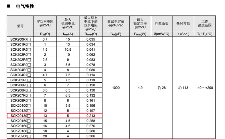熱敏電阻片徑: Φ20mm 零功率電阻@25℃: 13Ω 工作溫度范圍: -40℃±200℃ 儲存溫度范圍: -40℃±85℃