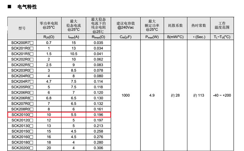 熱敏電阻: VT 熱敏電阻型號: SCK20100MSY 熱敏電阻片徑: Φ20mm 零功率電阻@25℃: 10Ω 工作溫度范圍: -40℃±200℃ 儲存溫度范圍: -40℃±85℃