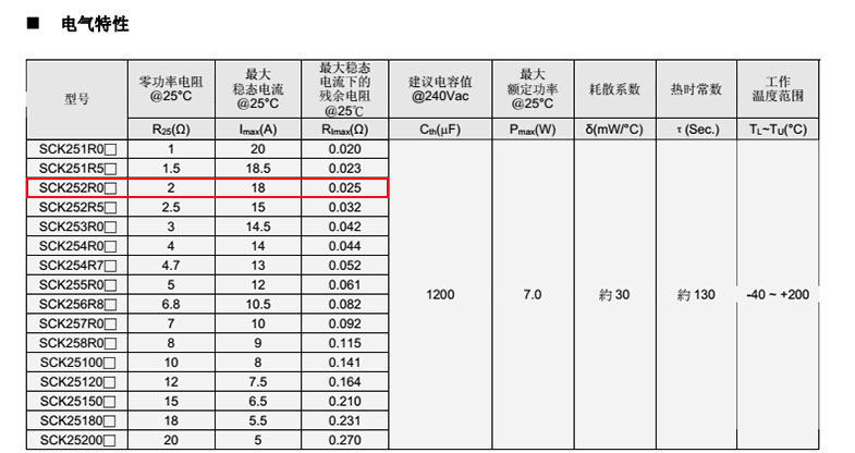 熱敏電阻: VT 熱敏電阻型號: SCK252R0MSY 熱敏電阻片徑: Φ25mm 零功率電阻@25℃: 2Ω 工作溫度范圍: -40℃±200℃ 儲存溫度范圍: -40℃±85℃