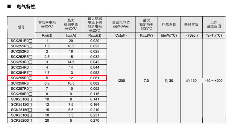 熱敏電阻: VT 熱敏電阻型號: SCK255R0MSY 熱敏電阻片徑: Φ25mm 零功率電阻@25℃: 5Ω 工作溫度范圍: -40℃±200℃ 儲存溫度范圍: -40℃±85℃