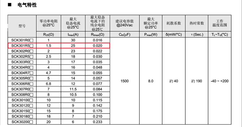 熱敏電阻: VT 熱敏電阻型號(hào): SCK301R5MSY 熱敏電阻片徑: Φ30mm 零功率電阻@25℃: 1.5Ω 工作溫度范圍: -40℃±200℃ 儲(chǔ)存溫度范圍: -40℃±85℃