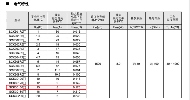 熱敏電阻: VT 熱敏電阻型號: SCK30150MSY 熱敏電阻片徑: Φ30mm 零功率電阻@25℃: 15Ω 工作溫度范圍: -40℃±200℃ 儲存溫度范圍: -40℃±85℃